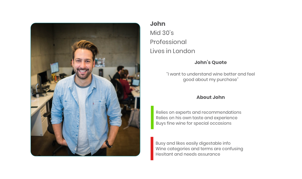 Although five personas were provided by the stakeholder, we focused on a single primary persona to avoid over-fragmentation. This persona represented shared needs across experience levels — reassurance, clarity, and confidence when purchasing wine.